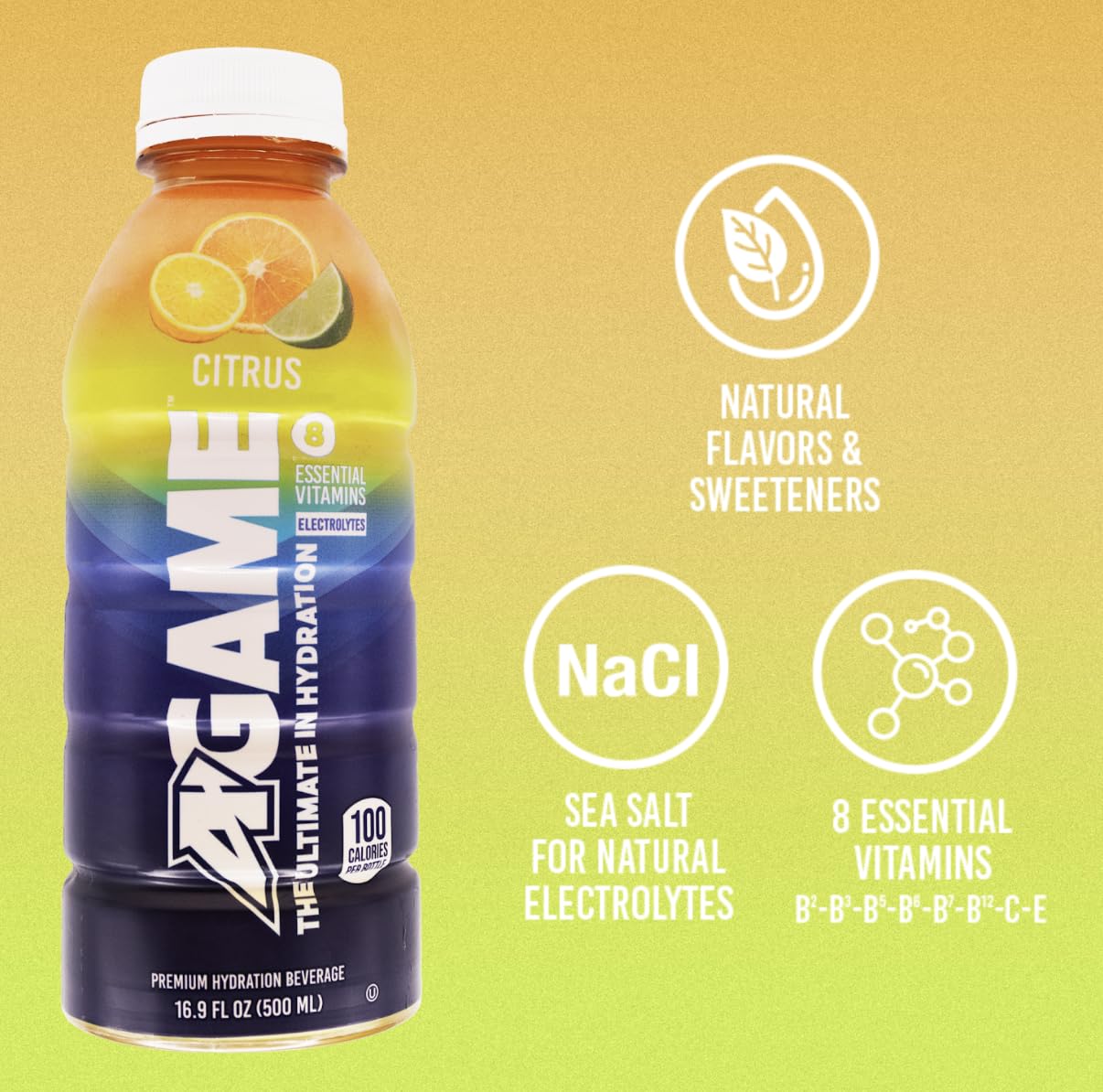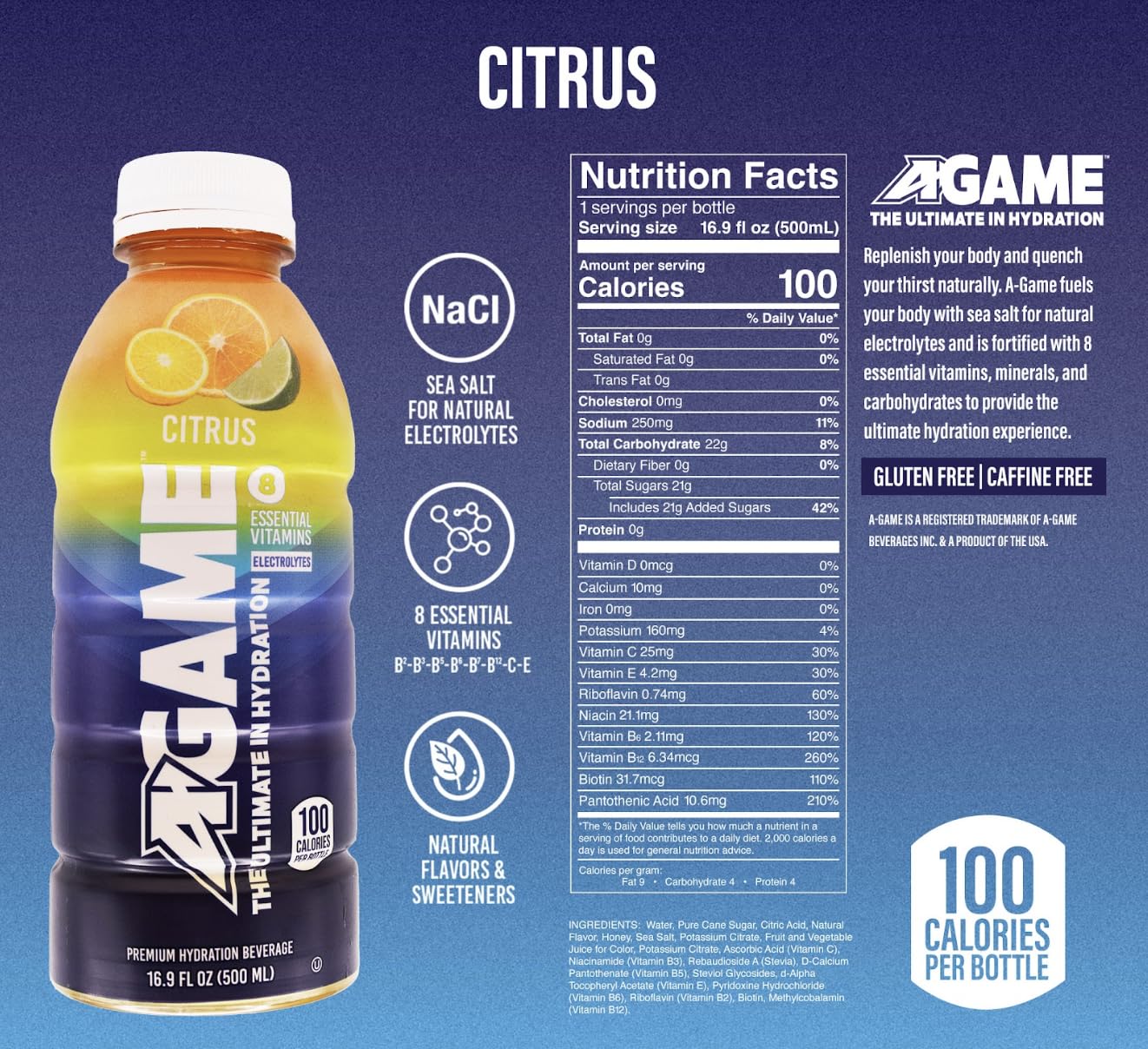 A-GAME Sports Drink, Citrus, The Ultimate Hydration Sports Beverage for Athletes, 8 Essential Vitamins including B, C, & E plus Natural Sea Salt Electrolytes, All Natural Flavors & Sweeteners, Gluten Free, 16.9 Fl Oz (Pack of 12)